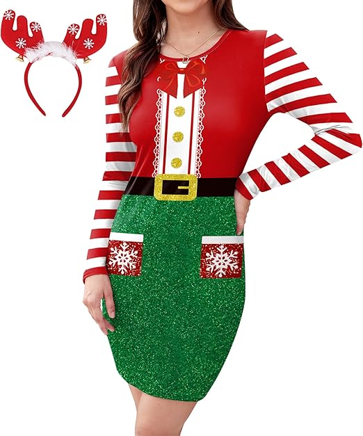 - Design and Style: Look for dresses with fun, holiday-themed designs such as snowflakes, Christmas trees, reindeer, or Santa. Traditional red, green, and gold are popular colors, but you can also opt for dresses in pastel shades, metallics, or even plaid for a festive but unique look.